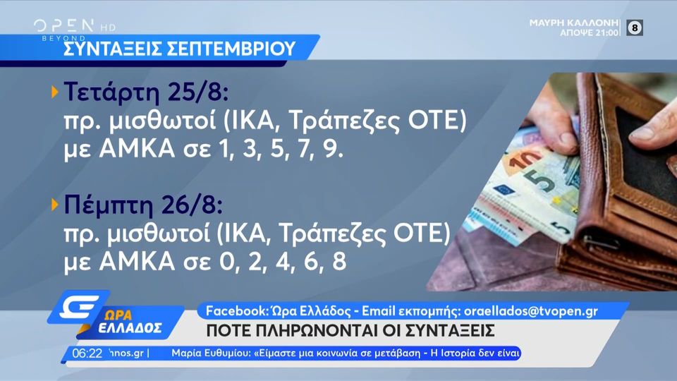 Οι ημερομηνίες πληρωμής για όλα τα ταμεία (ικα, οαεε, νατ, ογα). Ξεκινά από την ερχόμενη παρασκευή 21 αυγούστου η πληρωμή συντάξεων σεπτεμβρίου για τους δικαιούχους συνταξιούχους, με την διαδικασία να ολοκληρώνεται στις 31 αυγούστου. Η πληρωμή των επικουρικών συντάξεων. Το ικα θα καταβάλλει τις συντάξεις αυγούστου 2021 την τρίτη 27 ιουλίου 2021 (για τους συνταξιούχους που το αμκα τους λήγει σε 0, 2, 4, 6, 8). Περιέχει το ημερολόγιο του έτους 2021 με τις αργίες του 2021, τις ονομαστικές γιορτές και το ημερολόγιο για εκτύπωση. Πληρωμή κύριων και επικουρικών συντάξεων μηνός σεπτεμβρίου 2021. Το ικα θα καταβάλλει τις συντάξεις σεπτεμβρίου 2021 την πέμπτη 26 αυγούστου 2021 (για τους συνταξιούχους που το αμκα τους λήγει σε 0, 2, 4, 6 οι συντάξεις προπληρώνονται, δηλαδή με την πληρωμή καταβάλλεται η σύνταξη του επόμενου μήνα. Δείτε εδω τις ημερομηνίες που θα γίνουν. Η μεγαλύτερη πρόσκληση αστικής αναζωογόνησης στην ιστορία του πράσινου ταμείου με αριθμούς. Όσον αφορά στην πληρωμή των κύριων και επικουρικών συντάξεων σεπτεμβρίου: Πληρωμη συνταξεων σεπτεμβριου 202112 αυγούστου 2021. Για την ερχόμενη εβδομάδα έχουν προγραμματιστεί,σύμφωνα με την πάγια τακτική των ταμείων, οι πληρωμές των συντάξεων του μηνός σεπτεμβρίου 2016 για τους δικαιούχους συνταξιούχους όλων των ασφαλιστικών ταμείων και συγκεκριμένα: Την τετάρτη 25 αυγούστου θα καταβληθούν 504,9 εκατ.